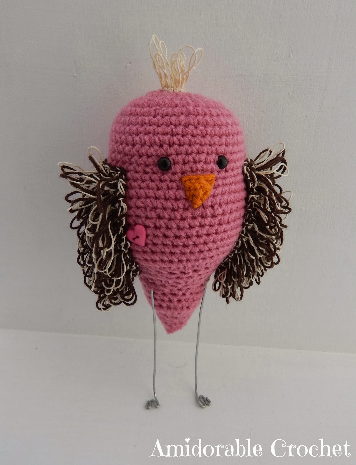 Now sew the wings on your Bird. Sew on the beak and hair, and weave in all ends.