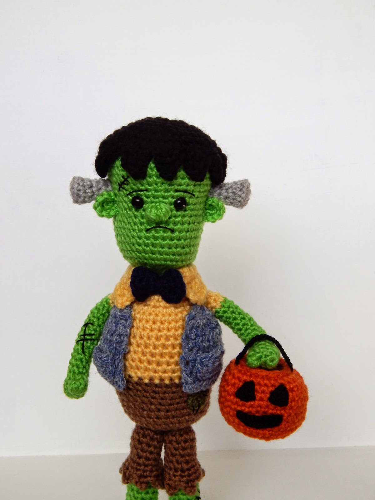 Sew the hair onto your dolls head. Use black crochet thread and sew on eyebrows just above the eyes, and a mouth. Sew on little scars. Attach the ears. Stuff the bolts and sew them just above and behind the ears. Make sure your body is stuffed firmly and sew the head onto the body. Sew the collar onto your doll. Stuff the arms and sew them onto your doll. Sew the soles onto the feet. Stuff the legs and sew them onto your doll. Sew the little patch onto the pants. Lift up the collar, and sew on the bow tie. Sew on the eyes and handle onto your pumpkin. Sew the pockets onto your vest. Weave in all ends and trim them.