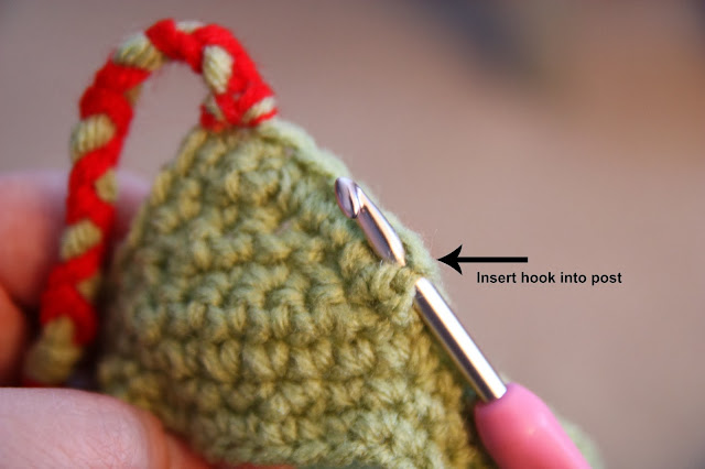 I gave the hats a frilly trim. To do this insert your hook into one of the posts on the last round of your hat.