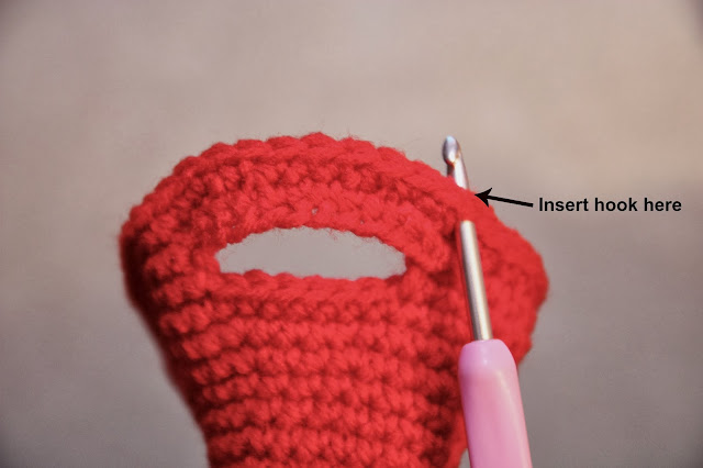 Row1:Hold the hat with the top of the hat pointing to the ground. On the right side of one of your ear holes insert your hook into one of the stitches and pull up loop, sc x 9 (9) (See photo below)